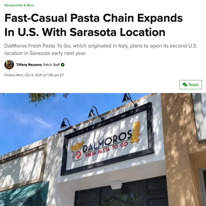 DalMoros Fresh Pasta To Go, which originated in Italy, plans to open its second U.S. location in Sarasota early next year.