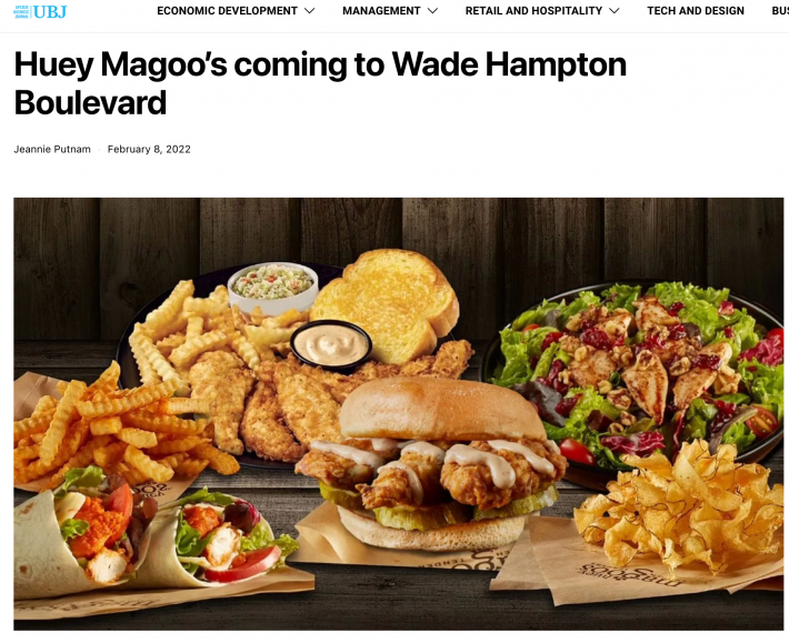 Huey Magoo’s, a restaurant chain specializing in fried chicken, announced Feb. 7 it will open a location at 2029 Wade Hampton Blvd. in spring 2022.