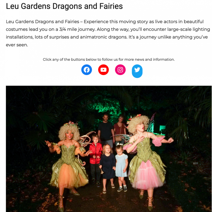Leu Gardens Dragons and Fairies – Experience this moving story as live actors in beautiful costumes lead you on a 3/4 mile journey. Along the way, you’ll encounter large-scale lighting installations, lots of surprises and animatronic dragons. It’s a journey unlike anything you’ve ever seen.