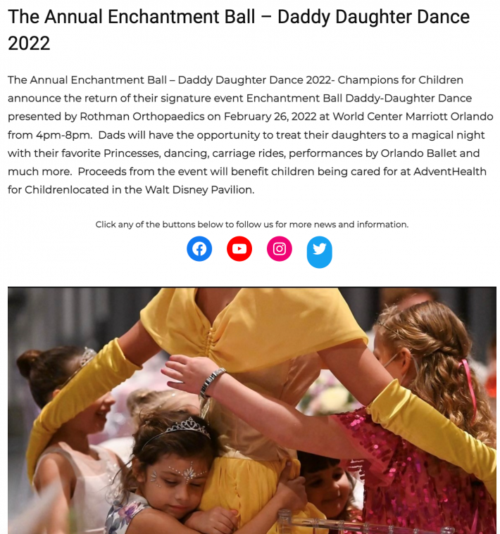 The Annual Enchantment Ball – Daddy Daughter Dance 2022- Champions for Children announce the return of their signature event Enchantment Ball Daddy-Daughter Dance presented by Rothman Orthopaedics on February 26, 2022 at World Center Marriott Orlando from 4pm-8pm.
