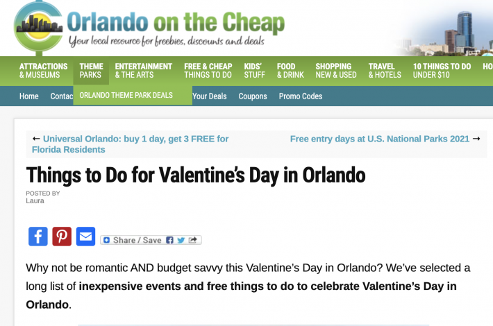 Why not be romantic AND budget savvy this Valentine’s Day in Orlando? We’ve selected a long list of inexpensive events and free things to do to celebrate Valentine’s Day in Orlando.